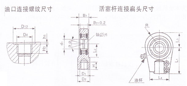 注:1.表中A.B.C型扁头可分别与活塞端为ⅠⅡⅢ型螺纹相配 2.当选用C型扁头时,可在扁头与活塞杆端螺纹连接处加扁螺母作适量调准